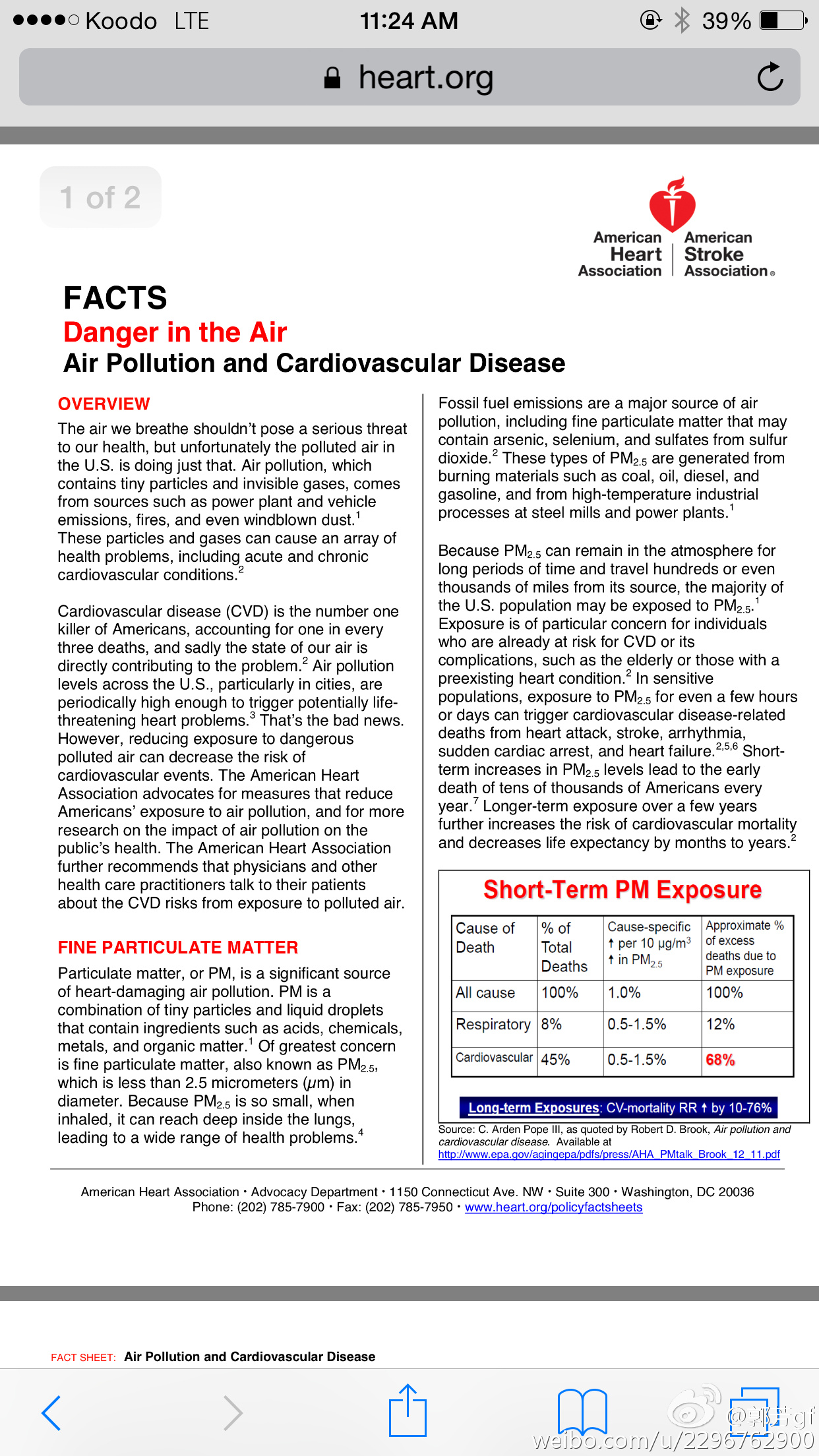 跟在北京的熟人聊天,说起雾霾严重的时候,呼吸道科病人固然多,不料心血管病人增加更多。不知道PM2.5究竟怎样影响到心血管的;但看美国心血管协会的一篇统计文章,对心血管的影响居然远高于呼吸道和肺。虽然改变环境无力,不过了解危害严重性至少能引起个人重视吧。很可惜还看到很多人在雾霾中跑步。