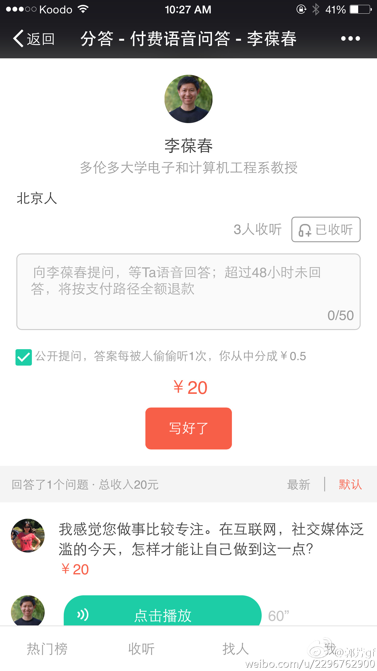 跟风玩分答。听了几条名人和朋友的,内容再说,感觉声音好听有魅力很重要,会让人有继续听的欲望。这算颜控的变种么?一分钟时间短,很多大的题目,感觉很难回答,也有理解错了答非所问。给家里先生的分答提了一个问题,颇像答记者问,也算全新感受,看到另一半的另一个侧面。还是很有趣的应用。