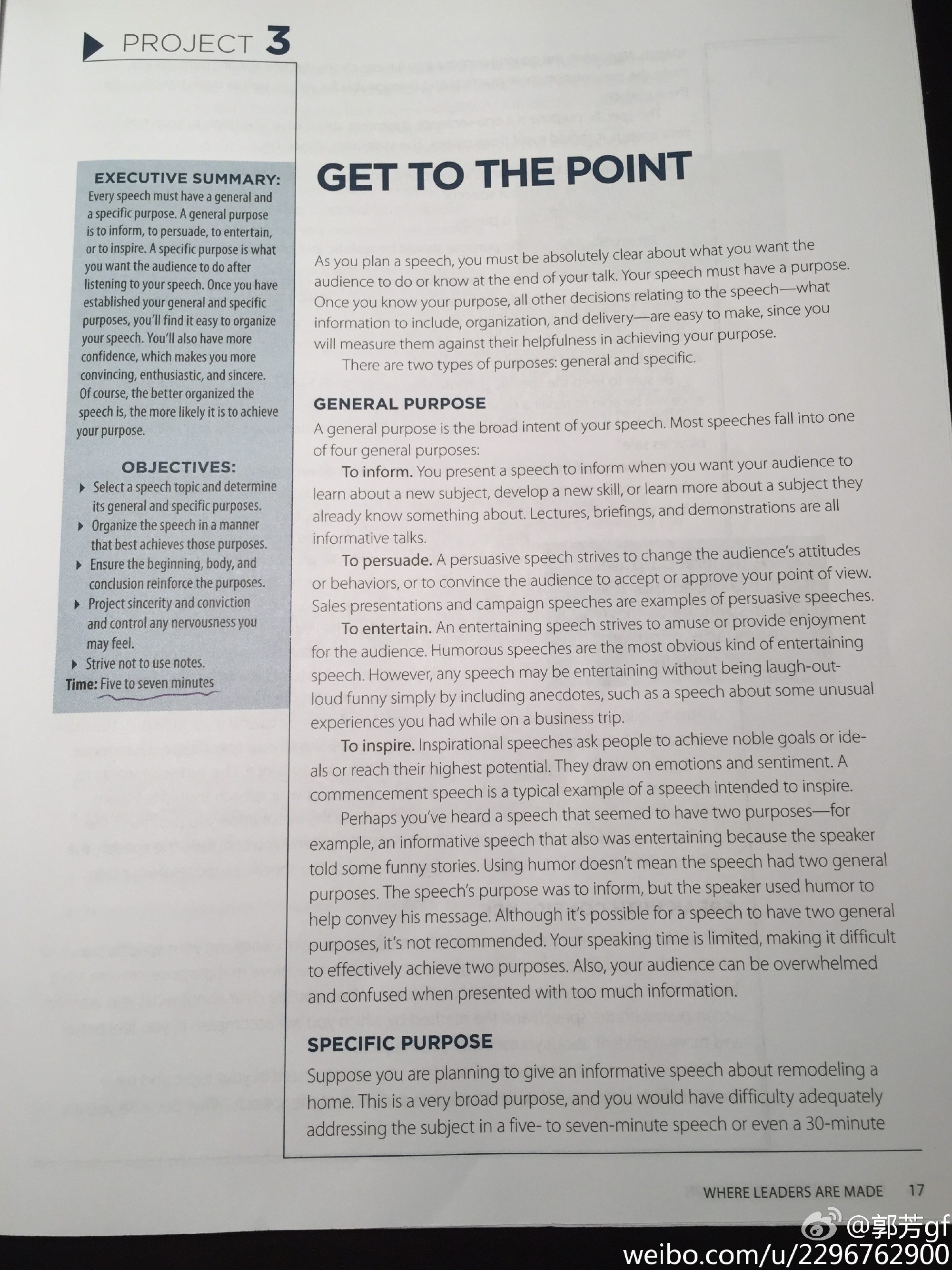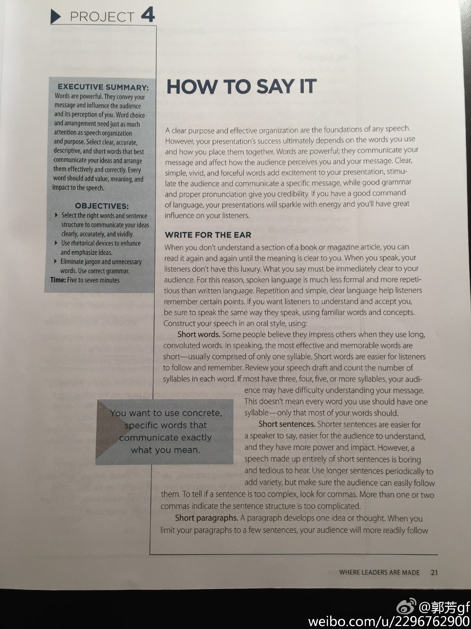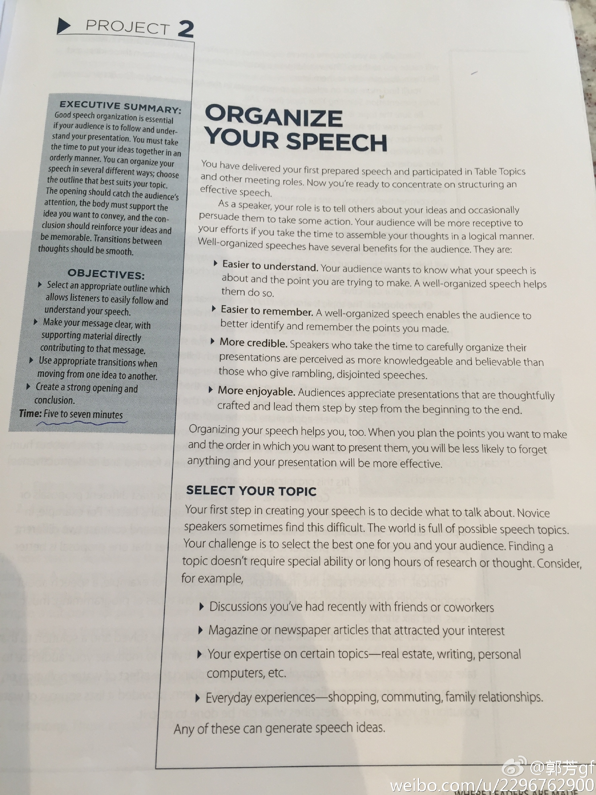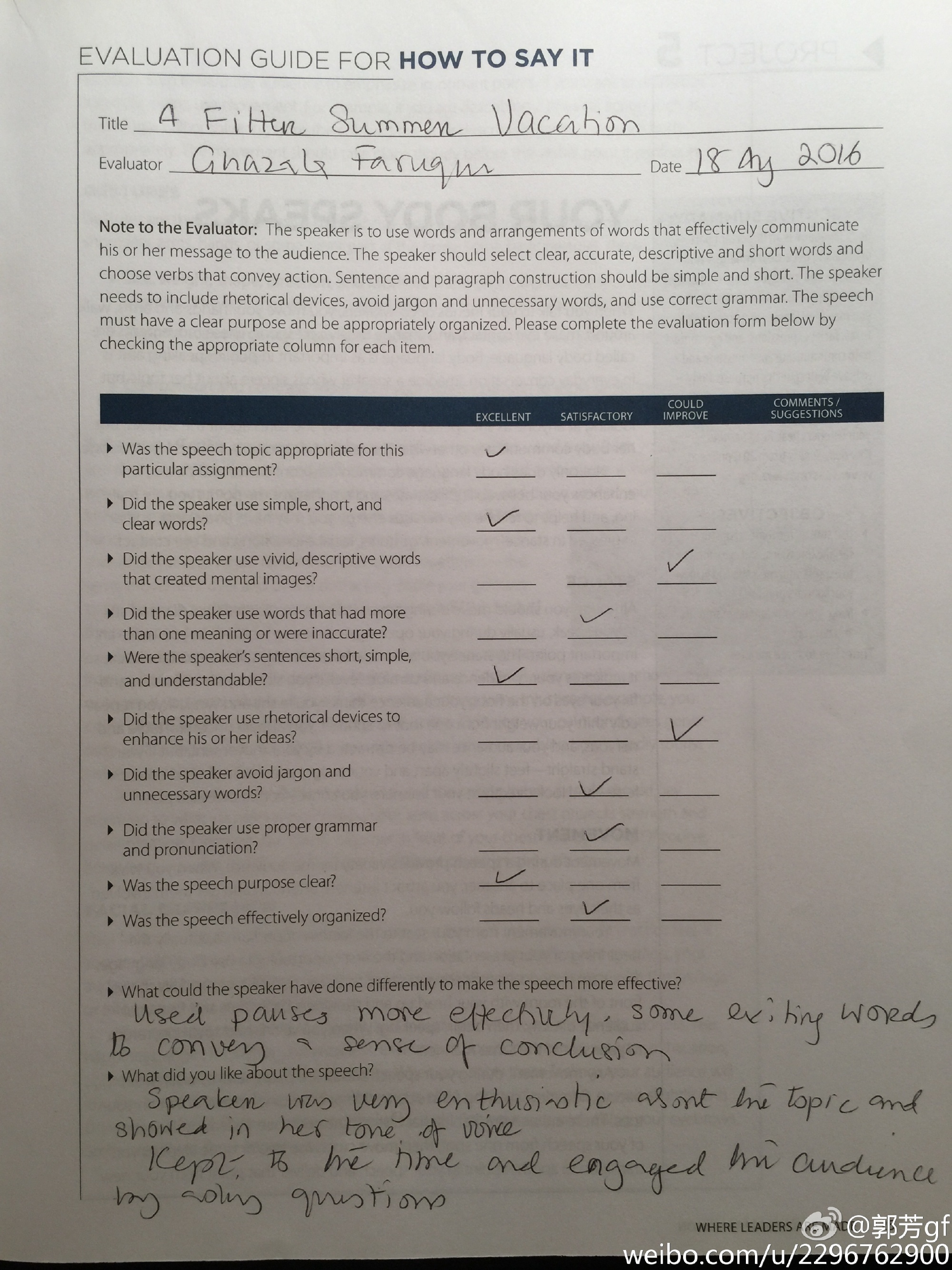 做Toastmasters第四个演讲,重点在词汇和句子组织,强调用短词短句短片段;尽量使用具体生动而非通用的词汇。适当使用比喻排比之类的修辞手法,也有助于听众的记忆。特别提到避免一些特别专业的词汇,使用相应的小词即可。这次题目是「A fitter summer vacation」,准备比较匆促,感觉不太理想。