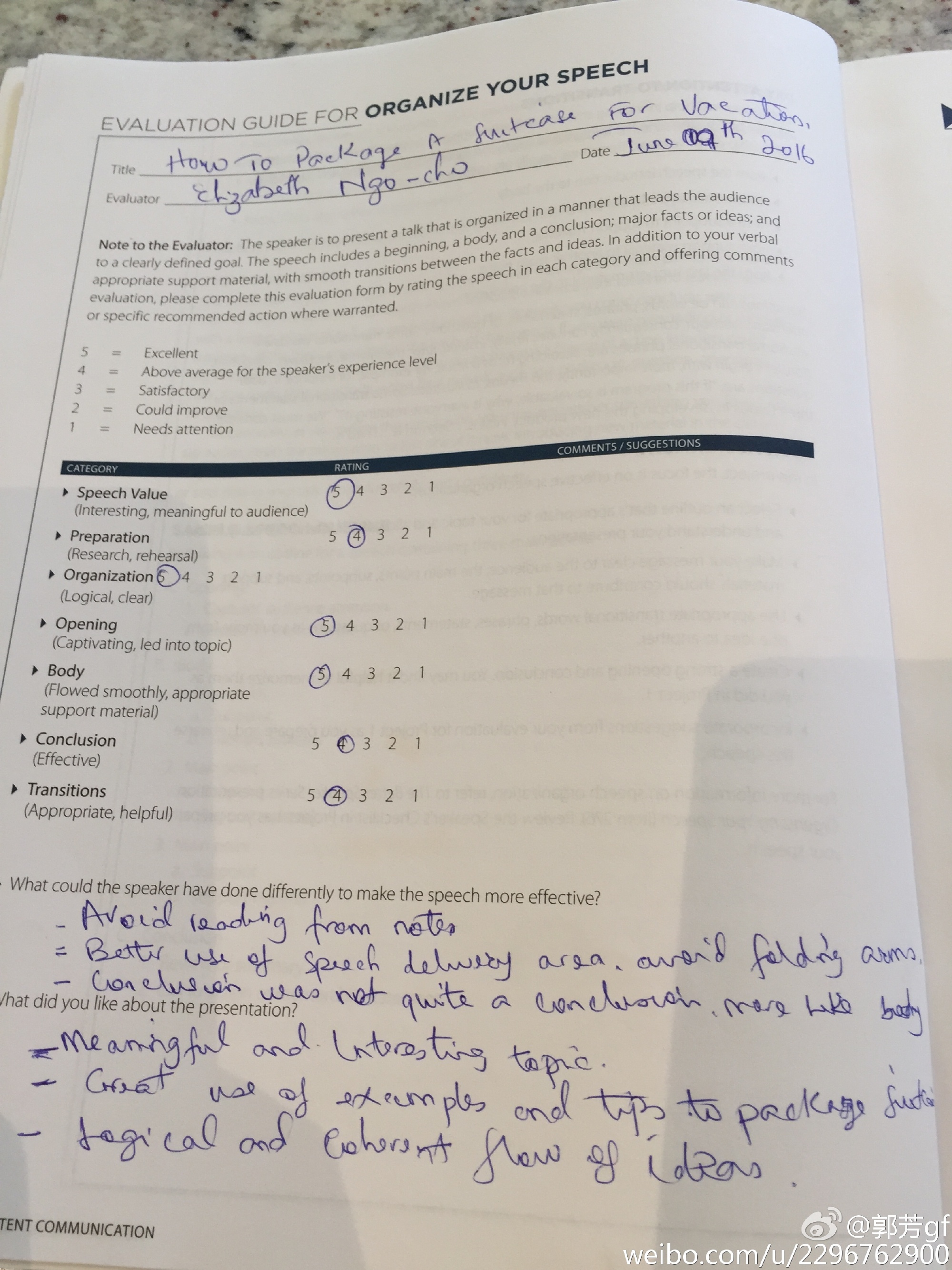 周四做了Toastmaster第二个演讲,侧重点在于需要设定清晰的总分总结构。琢磨了一阵选题,想到马上要去度假,定了“how to package a suitcase before vacation”,比较实用的一个话题。听众反响热烈,可能是因为跟自己生活息息相关。一位成员说,头一回听一个比较小而具体的话题,感觉比大而空有意义。