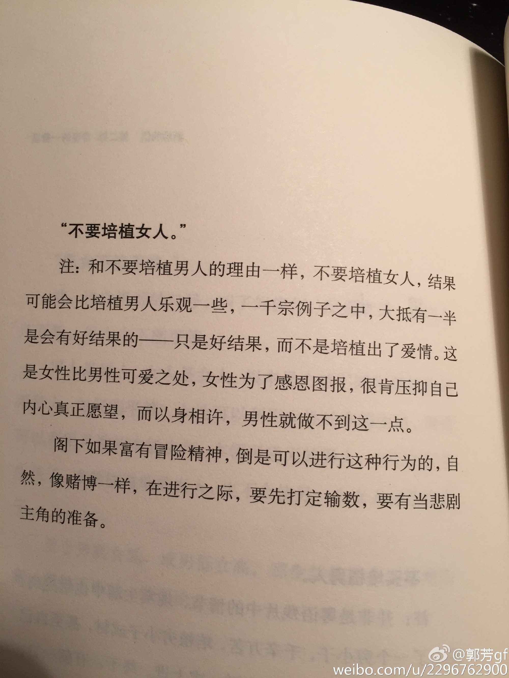 倪匡的这本散文集很有意思。每一篇都很短,道出性情中人对人生方方面面的看法。这篇关于男女的短文,我完全赞同,特地跟大女儿一起读。读完讨论,女孩子年轻的时候,容易为爱情放弃自己,咱们这样聪明优秀,做好自己自然会有优秀的男生齐头并进,牺牲完全没必要。女儿点头认同。也算提前打打预防针吧。