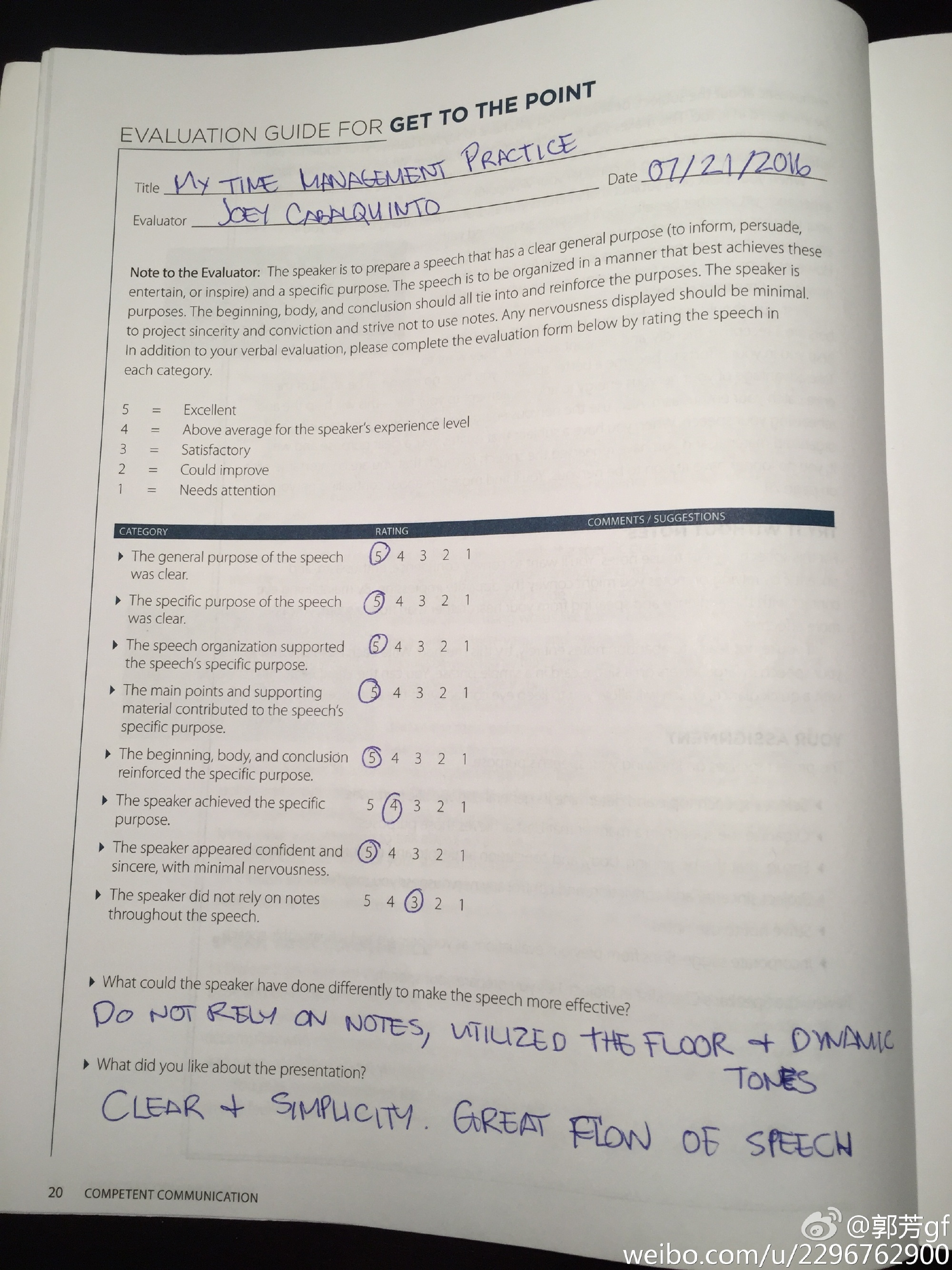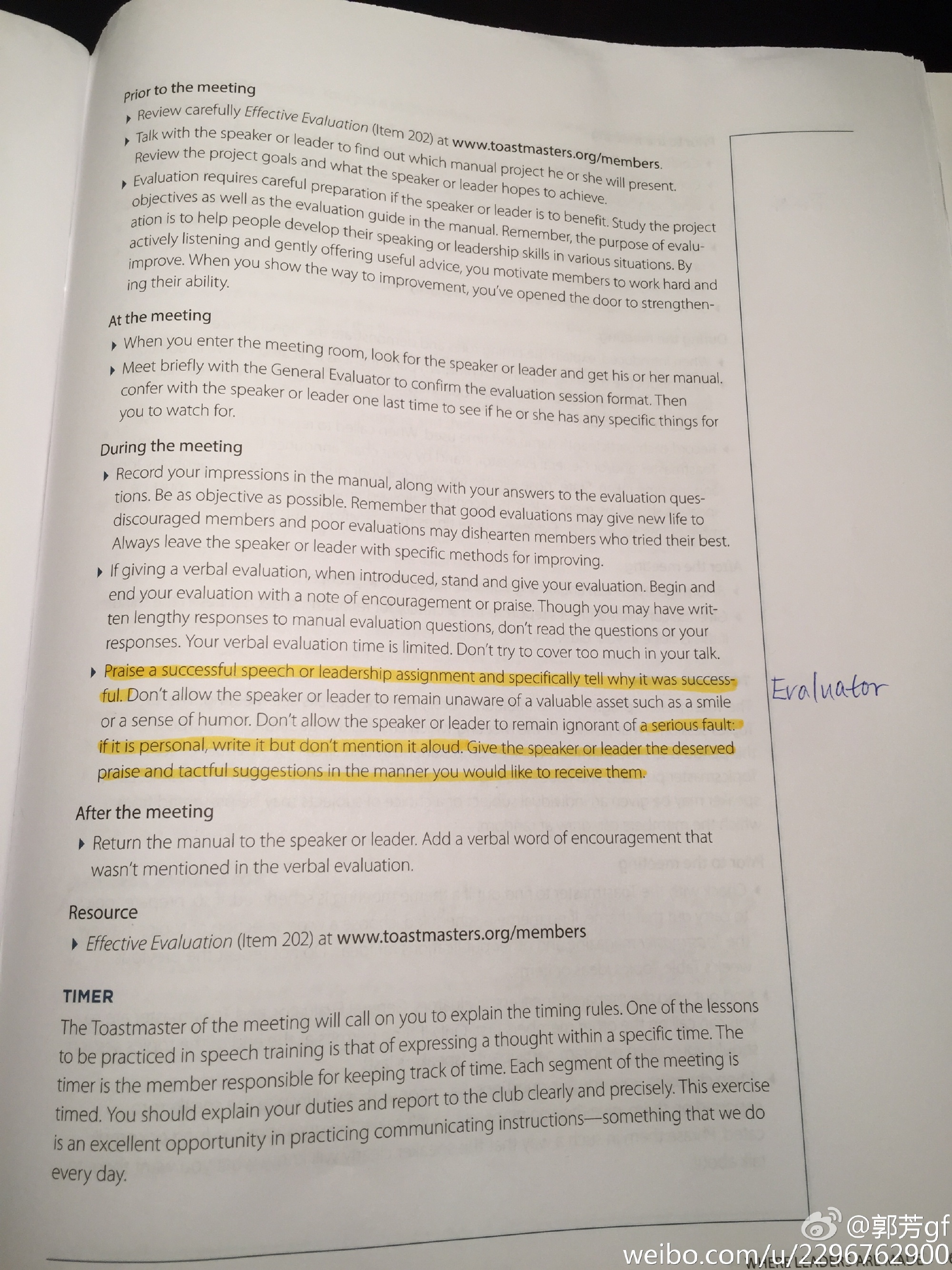 参加ToastMasters Club,经常需要担当一定的角色。今天研读手册,主要看看Evaluator的职责,写得非常细致。关于给演讲者评论和建议,提到好的地方要不吝言辞地表扬,不好的地方在指出和提建议的时候要有技巧。实在太个人化的建议,可以写下来不必当众说。总之就是换作是你在这种情况下能够接受的程度。