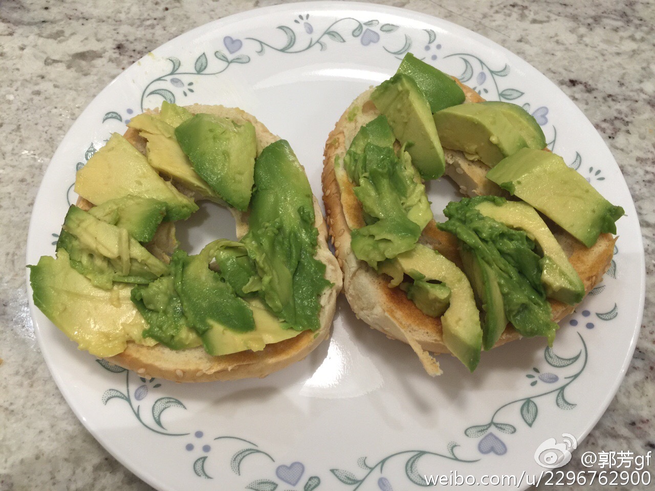 喜欢牛油果。卷在寿司里美味自不必说,拌在沙拉里也很好。从超市买来的牛油果一般都偏生,放久了又容易发黑变坏。最近总结经验,买来搁在冰箱里,每天拿一个出来放两天成熟刚刚好。我很爱吃烤得脆脆的Bagel,朋友推荐上面抹上牛油果的吃法。今日尝试,上软下脆,两者叠加,有点强强联合的意思,好吃。
