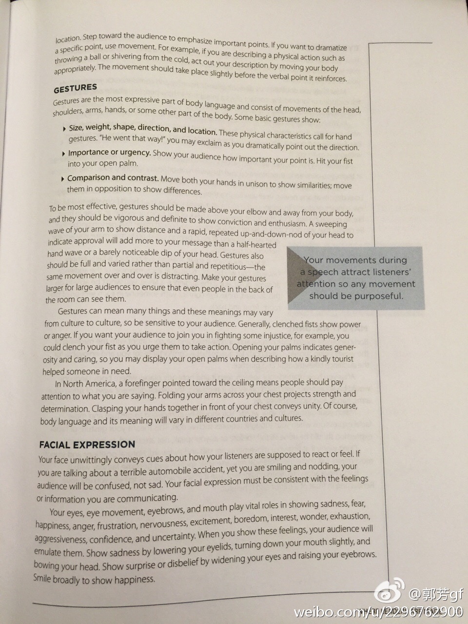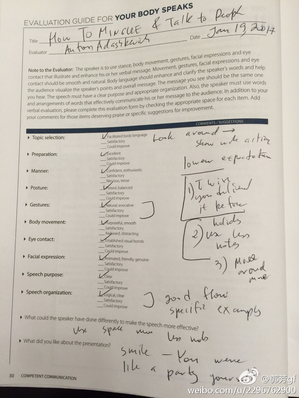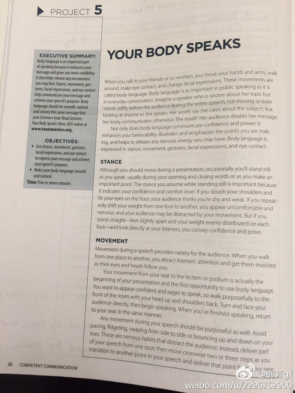 周四做了Toastmasters第五个演讲。这次的主题是注重身体语言,比如说用合适的手势,面部表情和目光接触。我讲的题目是”How to mingle and talk with people at parties”。准备的过于仓促,离不开讲稿,这样也就不能充分利用讲台的空间,姿态表达也不够充分,感觉很不满意。
