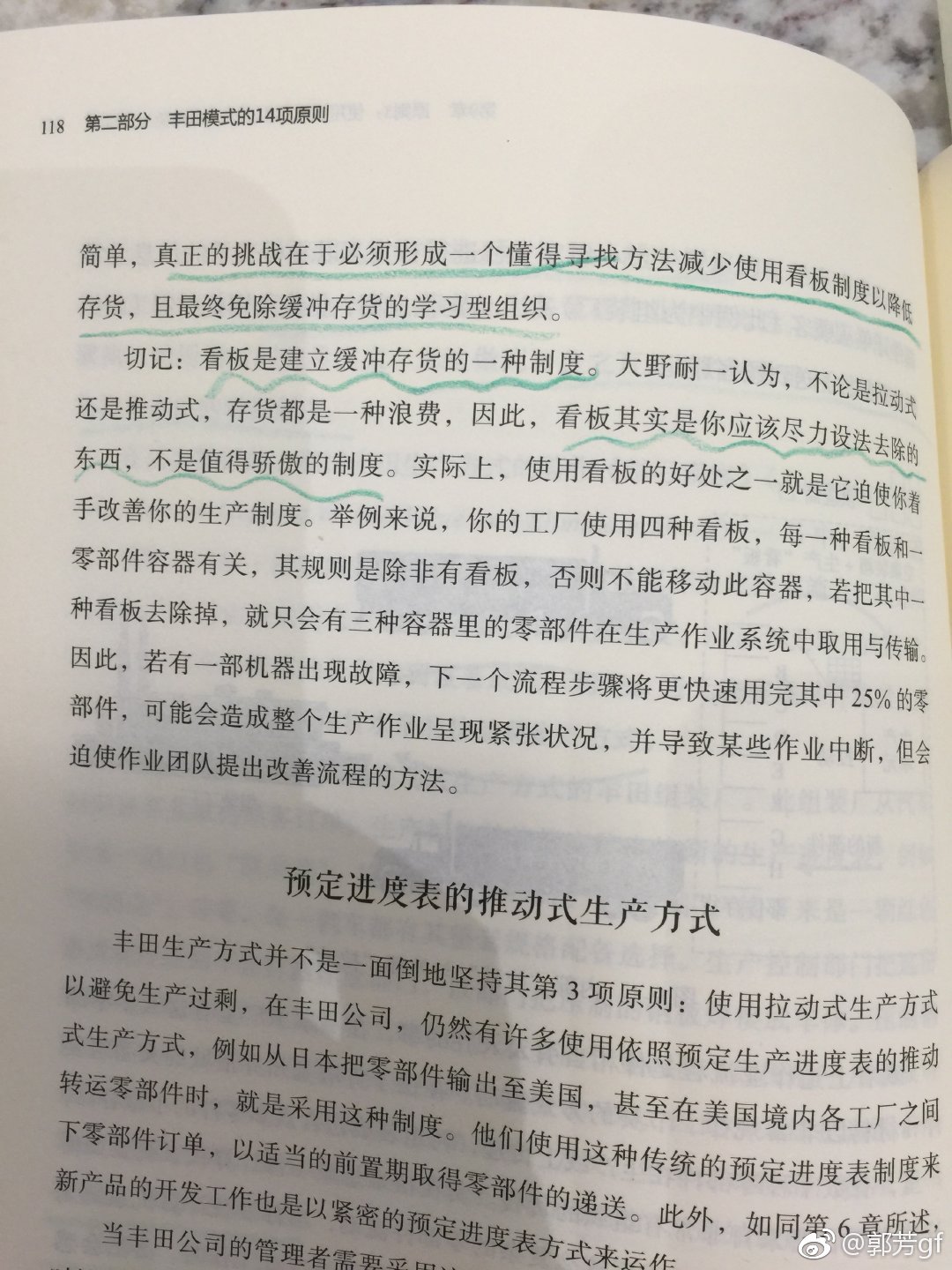我们在项目实施中常常使用看板(Kanban),效果很好。书中提到,理想状态仍旧是单件流(One Piece Flow),减少中间积压,看板属于不得已而求其次。这令我十分惊讶,一直以来都认为看板是很棒的流程管理办法,跟单件流并列。再一思索,想来理想是应该尽力靠近与实现;然而现实中难免有差距,退而求其次说明也是理想现实平衡之后的最佳选择。