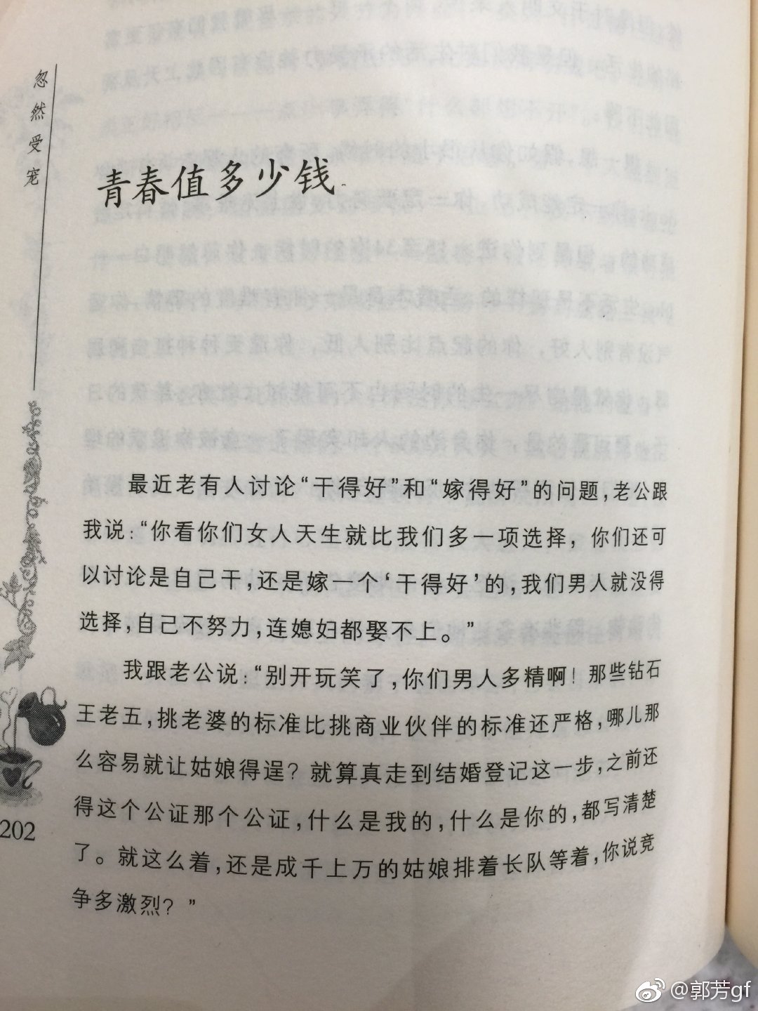 「忽然受宠」和「女人的幸福与什么有关」就是这样两本书。看她在文中嬉笑怒骂,有时甚至貌似尖刻损人,却常常道出生活的真实。主题以时尚,爱情,婚姻,生活为主。我虽早早恋爱,早早结婚,却也从她的文字中收获不少。英文有个词叫Street Smart,大意是市井通俗意义上的聪明,这种聪明要学会可真是太难了。
