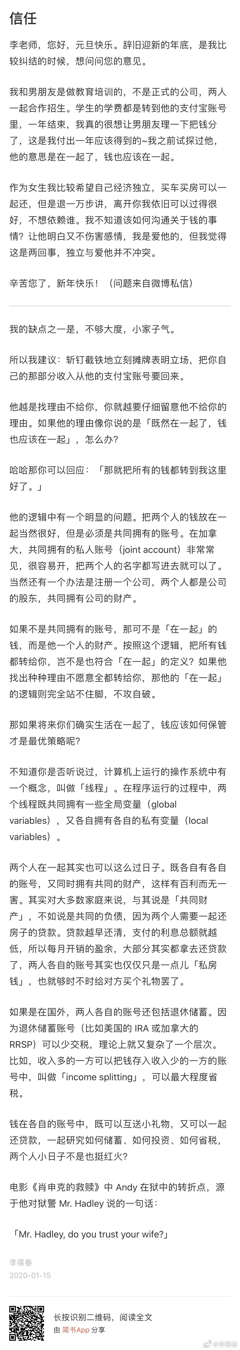 忽然想起来,二十多年前,葆春(当时还是男朋友)揣着好不容易换来的一千美元出国留学。剩下的几千人民币,是他做程序打工挣的,全留给了还在国内读书的我。当时好像也没觉得怎么样,现在想想,居然很感动。