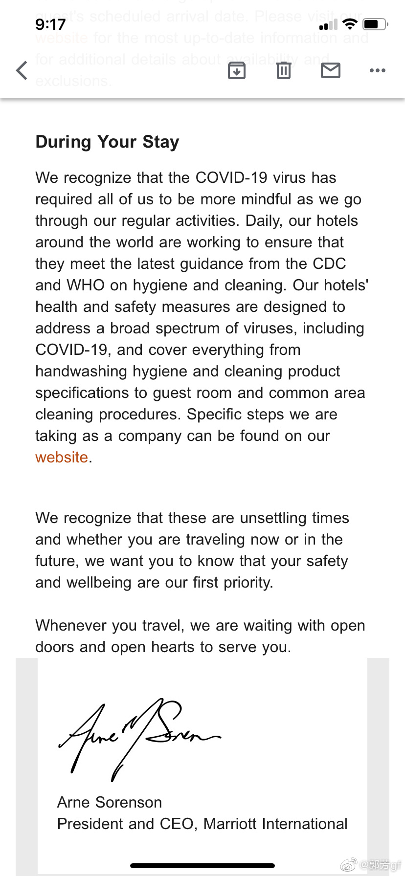 收到不少公司的CEO发来的关于Covid-19的通告。住过的酒店,买过文具的文具店,去过的电影院,林林总总,才发现自己的电子邮箱地址存在于多少公司的数据库系统当中。我每一篇都仔仔细细地看了。每一篇都是通告的范文。行文措辞,简单严谨,逻辑清晰,又不乏小小温情。最喜欢Marriott通告的结尾:
