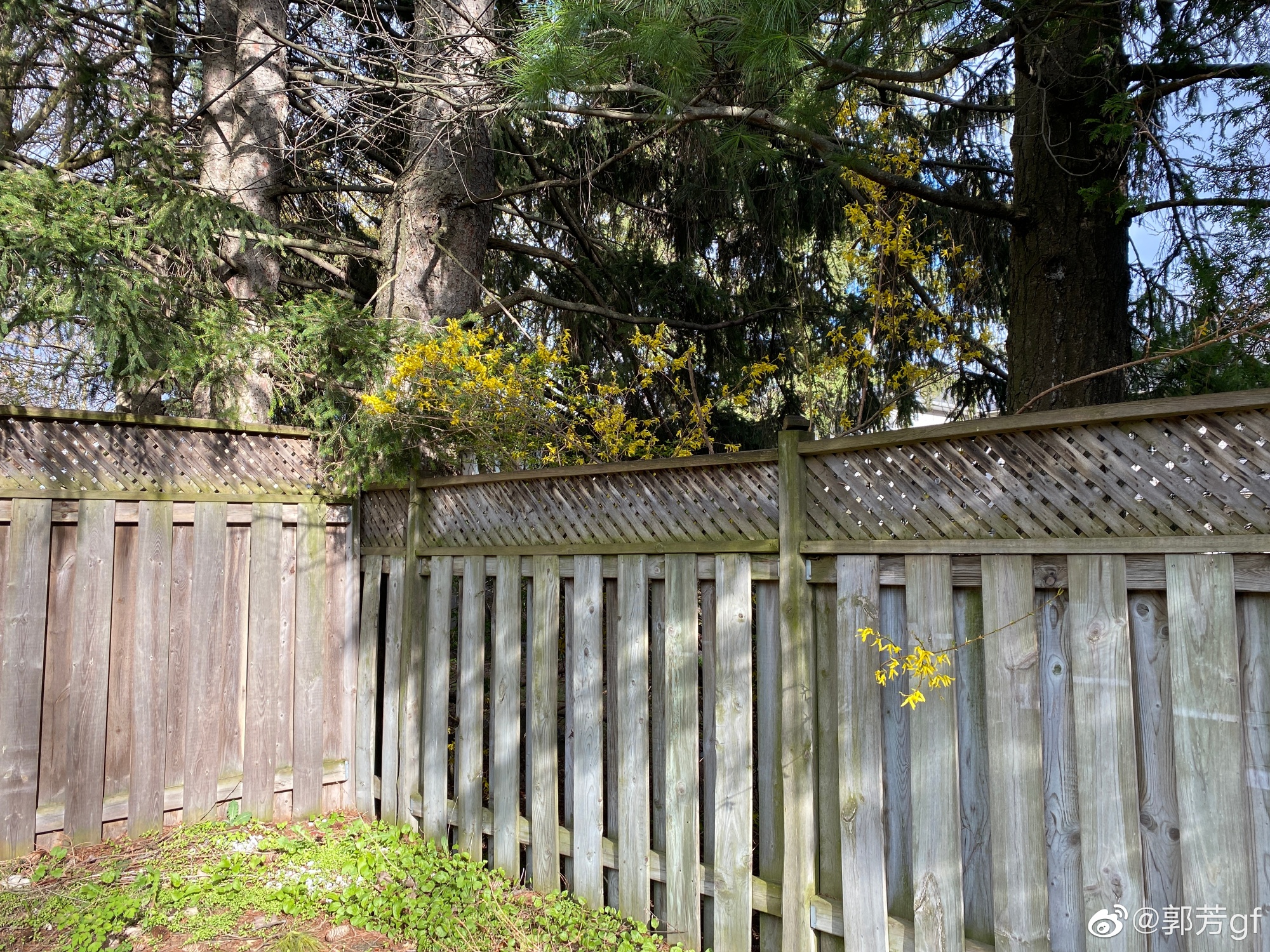 后院邻居家的迎春花,黄灿灿一片,已经开了些日子,仍旧很旺,只是绿叶的芽儿也生出来一点儿了。一支调皮的花枝从栅栏缝隙伸出来,在风中摇曳,倒也别致,与往年不同。