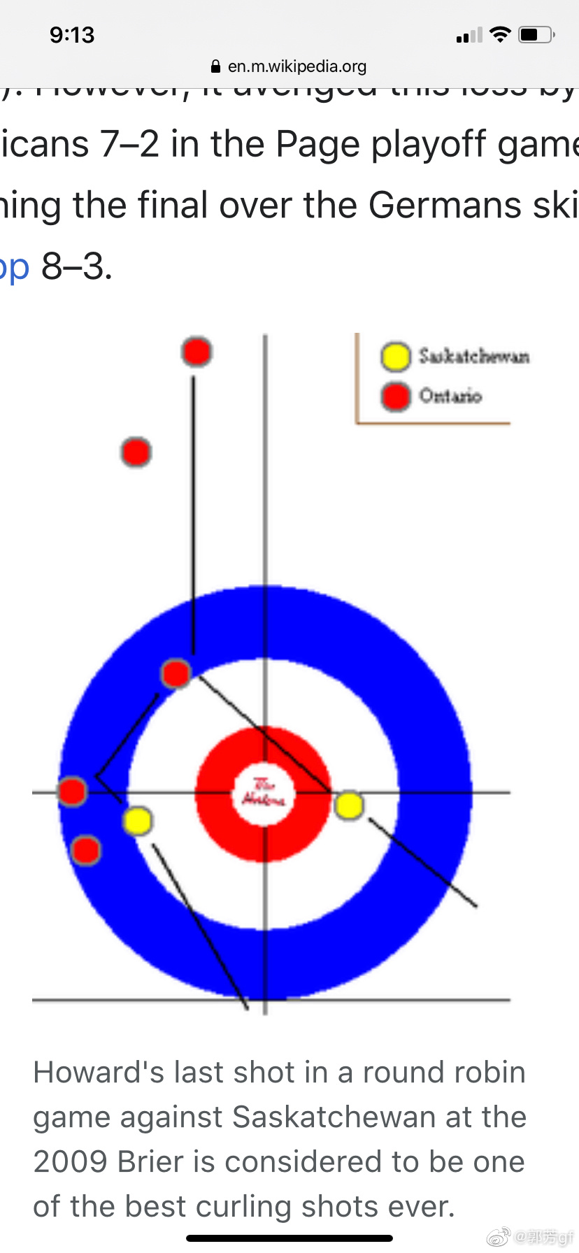 其中一个问题是,在比赛中有没有特别难忘的一个时刻?我们看到这样一张形势图,轮到他掷最后一个冰壶定乾坤。此刻对方两个黄色冰壶居中,同时又有一定距离,目测一石两鸟几乎不可能。