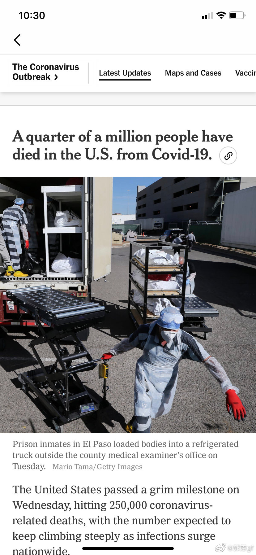 标题是,“A quarter of a million people have died in the U.S. from Covid-19” (二十五万美国人死于Covid-19)。