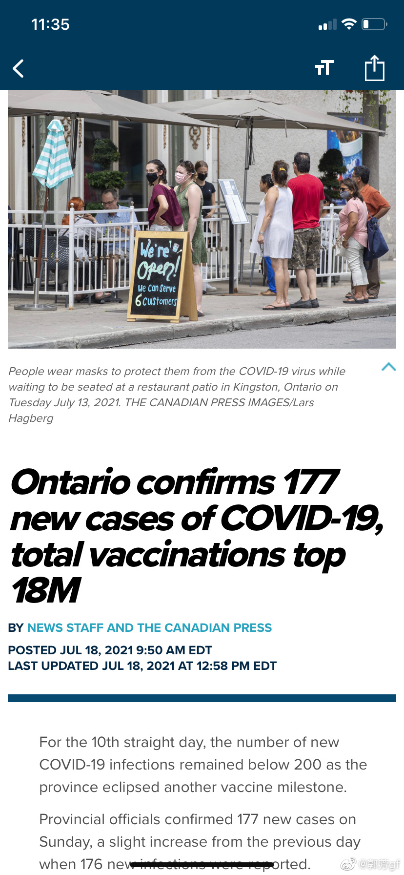 新闻播报,安大略省的第一针疫苗接种率已经达到80%,于7月16号进入开放第三阶段,比计划提前了几天。多伦多这一年多来,开了关,关了开,被戏称为“开封府”,但愿这次不会再关了。