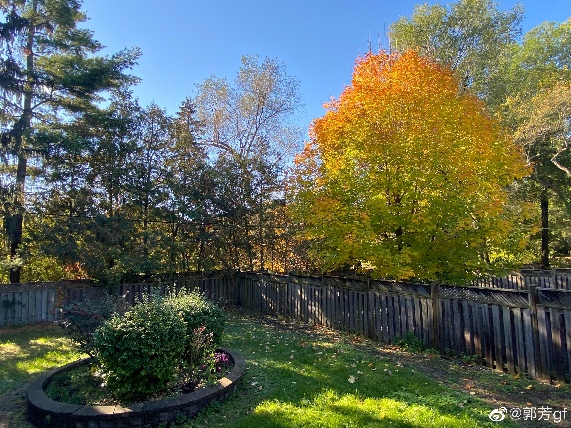 前两天下了雨,后院的草地小径上散落着缤纷的落叶。一早去后院,清晨的阳光,还有些柔弱,却给邻居家的枫树带来蓬勃的朝气,整棵树都像在发着光。