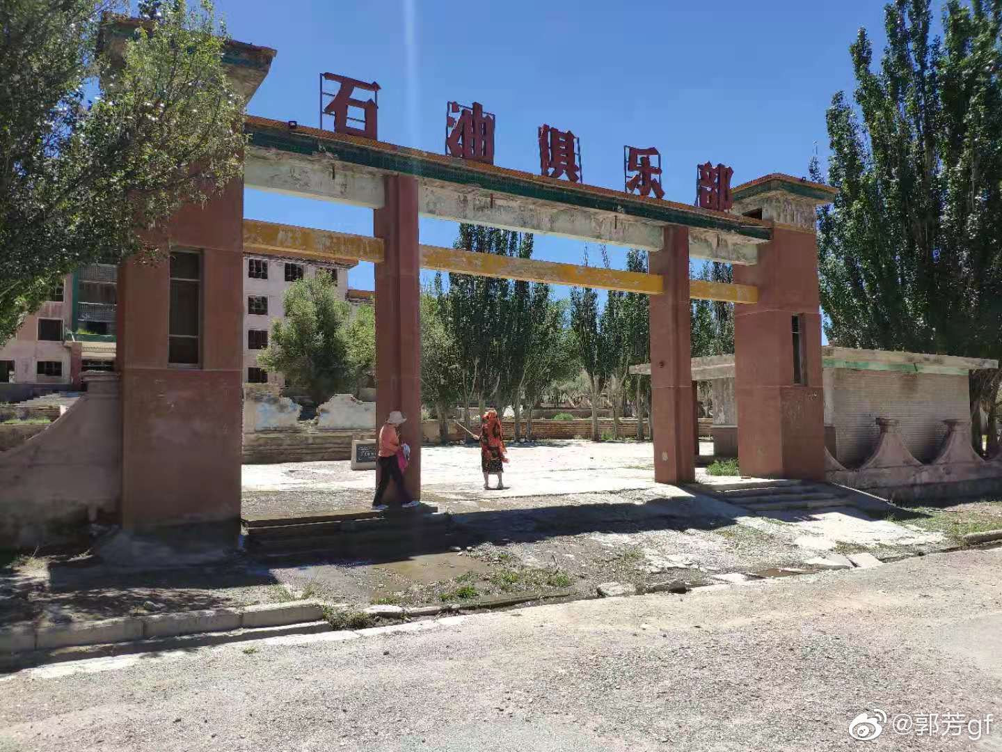照片里,“石油俱乐部”几个红色大字,立在残旧斑驳的门框之上。门前碎石杂草,院内几段残垣。据说是从前的青海油田冷湖基地。