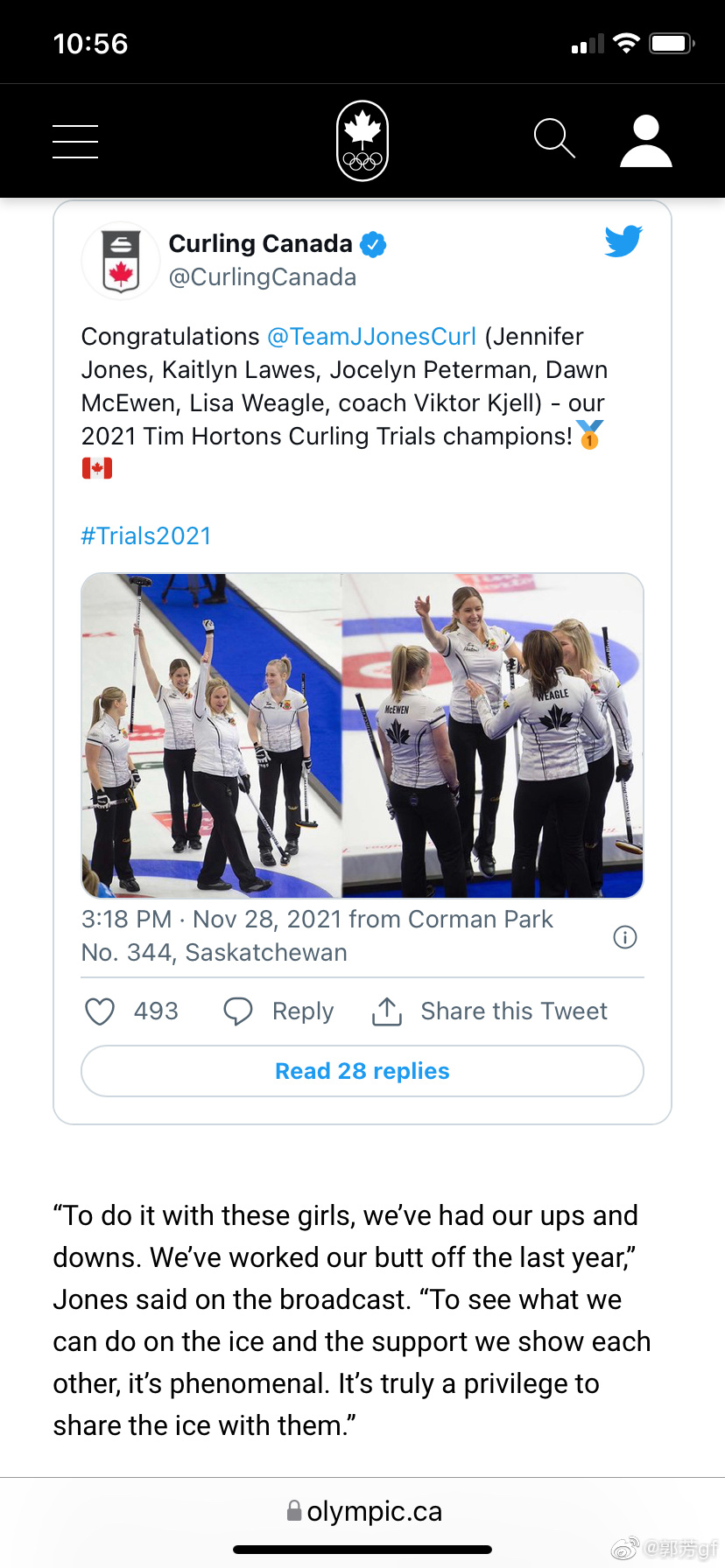 Jennifer是谁呢?叫的这么亲切!她全名Jennifer Jones,她做领队的女子冰壶队上周刚刚赢得加拿大境内的选拔赛,将代表加拿大出征北京2022冬奥会。她的队伍2014年曾获得索契冬奥会的冠军,打败了瑞典队。
