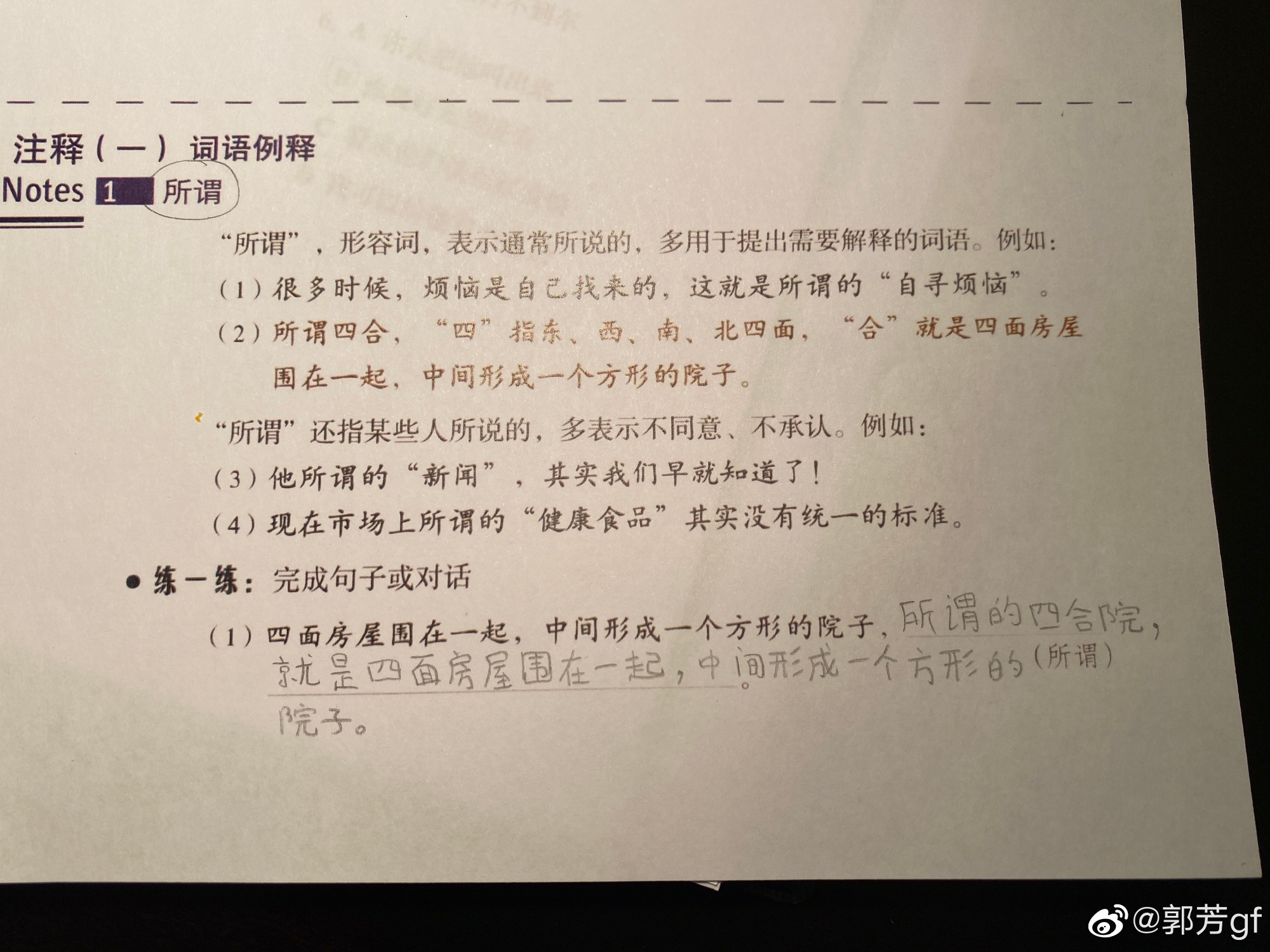 用“所谓”写句子。原句是,“四面房屋围在一起,中间形成一个方形的院子。”